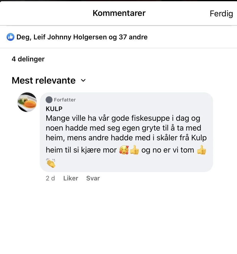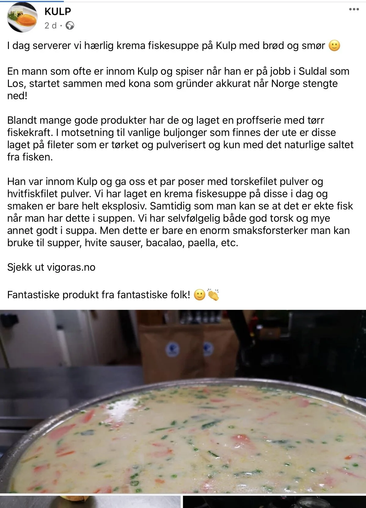 KULP Bistro og Takeaway restauranten i Sand fikk noen av våre smakstilsetninger som de prøvde ut i fiskesuppen deres. Dette falt i smak og vi ble veldig glade for positive tilbakemeldinger! Ved en tilfeldighet var en bekjent innom KULP og kjøpte akkurat denne fiskesuppen. Han fortalte at suppen var helt fantastisk, noe vi syns er utrolig gøy!